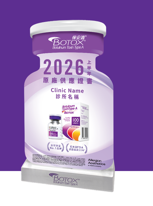 療程前先查證每半年由廠商 Allergan Aesthetics 授予醫療中心的 BOTOX®保妥適®原廠供應證書。確保讓擁有認可資格的專業醫生為你進行療程,獲得最全面的保障! Before taking BOTOX® treatment, please check the certificate issued every 6 months from Allergan Aesthetics. Consult qualified doctors and beauty centres to ensure receiving reliable treatment.